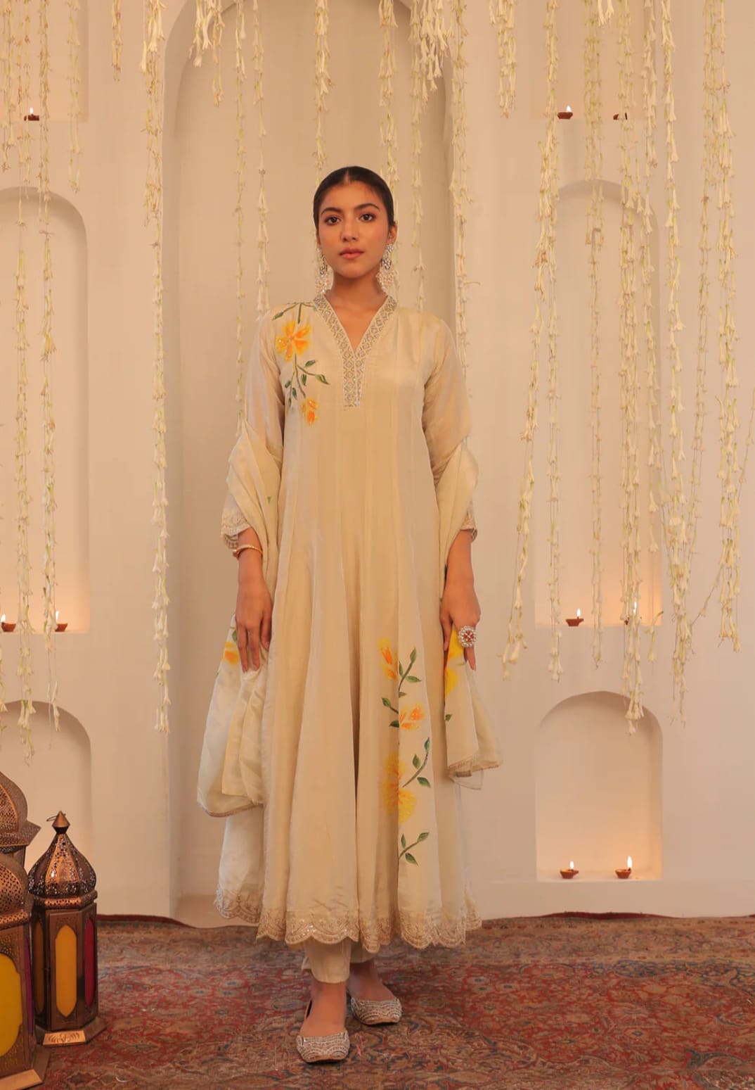 Designed for comfort as well as beauty, the flared silhouette of the Anarkali drapes effortlessly, flattering all body types while allowing ease of movement. Pair it with statement earrings and embellished juttis to complete your elegant look.