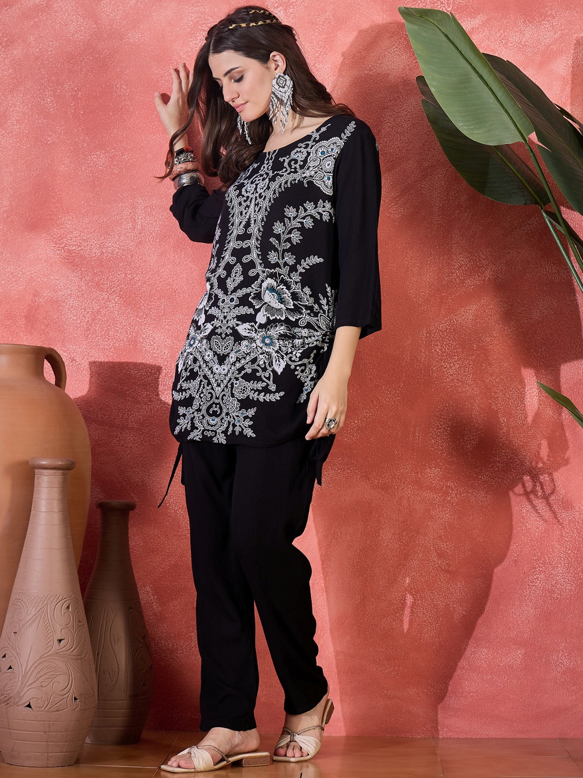 Step out in style with this Black Co-ord Set, featuring intricate embroidery that adds a touch of elegance and sophistication. The perfectly matched top and bottom create a chic, effortless look, making it ideal for parties, casual outings, or evening events.
