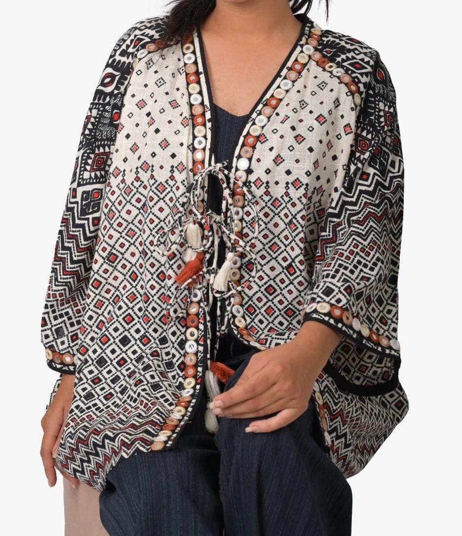 Celebrate tradition with a modern twist with this Three-Piece Ajrak Print Set. Featuring a beautifully printed Ajrak jacket, matching pants, and a comfortable inner top, this ensemble combines classic craftsmanship with contemporary style. The vibrant patterns and elegant tailoring make it perfect for festive occasions or stylish casual wear.